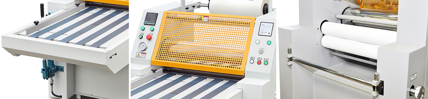 Призначений для одностороннього ламінування листових матеріалів шириною до 720мм. Ламінатори даного типу застосовуються в поліграфії для тиражного ламінування як цифрових так і офсетних відбитків. Універсальний у роботі з ламінування поліграфічної продукції різної товщини. Ламінує всіма типами плівок для гарячого ламінування товщиною від 20 до 42 мкм. Швидкість ламінування до 18 м/хв. Гідравлічна система притиску ламінуючих валів забезпечує рівномірний та потужний притиск плівки по всій площі прилягання та дозволяє якісніше ламінувати будь-який папір та картон на високій швидкості. Хромований вал діаметром 200мм. забезпечує велику площу прогріву плівки. Для зручності подачі листів у ламінаторі встановлено стіл із транспортерними стрічками. Роликовий перфоратор краю плівки – для полегшення відриву готової продукції. Регулює температуру від 50 до 130°C. Ламінатор працює із плівками в намотуванні до 3000 метрів. Пристрій змотування заламінованого матеріалу дозволяє працювати одному оператору.